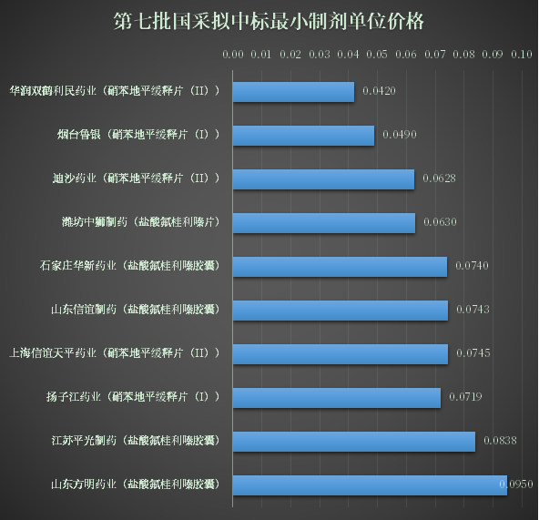 對比前幾次國采,本次出現(xiàn)單價(jià)小于0.1000元的企業(yè)報(bào)價(jià)較多,其中華潤雙鶴利民藥業(yè)(濟(jì)南)有限公司的硝苯地平緩釋片(II)以單價(jià)0.0420元的價(jià)格成為本次國采的最小單位價(jià)格,這也是繼第三批國采之后最小制劑單位重新出現(xiàn)價(jià)格低于0.050元。單位價(jià)格低于0.1000元的企業(yè)藥品如下圖,所有擬中標(biāo)品種的價(jià)格見文末表格。
