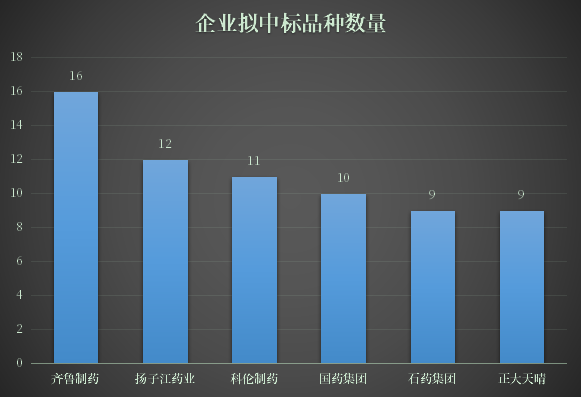 中標(biāo)數(shù)量最多的為齊魯制藥,17個(gè)產(chǎn)品入圍16個(gè)產(chǎn)品中標(biāo);其次是揚(yáng)子江藥業(yè)有12個(gè)產(chǎn)品中標(biāo),科倫制藥和國藥集團(tuán)分別有11個(gè)和10個(gè)產(chǎn)品中標(biāo)。