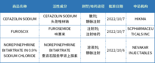 除了原創(chuàng)新藥,10月FDA還批準(zhǔn)了3款改良型新藥,包括頭孢唑林鈉散劑、 呋塞米皮下注射劑、重酒石酸去甲腎上腺素溶液劑。