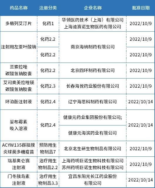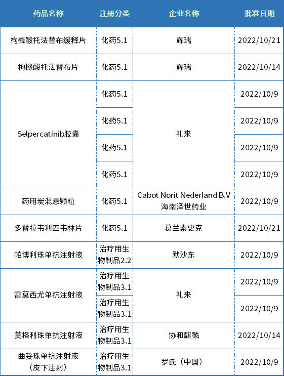 2022年10月,中國(guó)國(guó)家藥品監(jiān)督管理局(NMPA)共批準(zhǔn)了9款新藥,包括1款1類創(chuàng)新藥,5款2類新藥,以及3款生物制品。